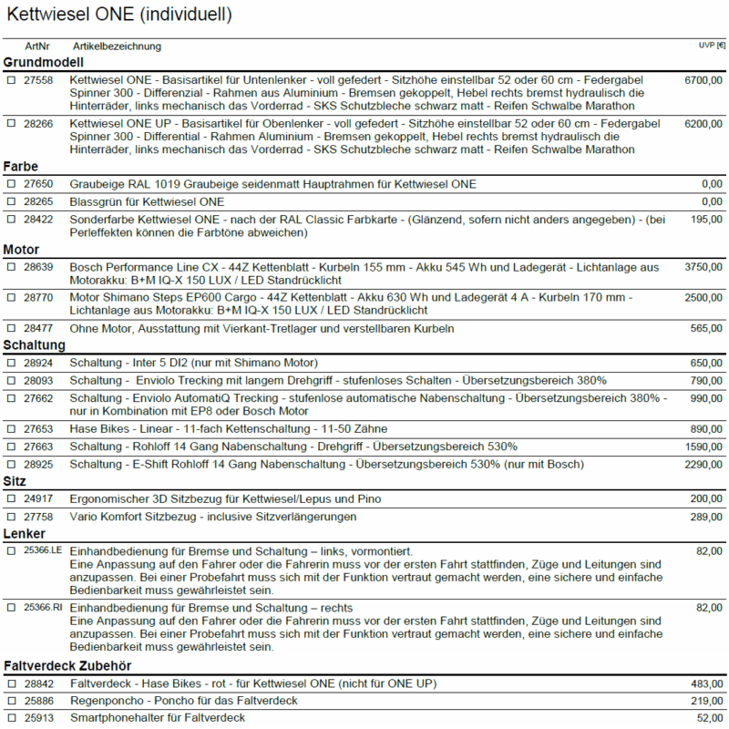 Grundsätzlich gibt es das Hase Kettwiesel ONE Custom mit Lenker unten oder abklappbarem oberen Lenker (wie bei einem „normalen“ Rad) als Variante UP. Diese beiden Varianten gibt es dann noch mit Shimano oder Bosch Motor (PLUS). Außerdem gibt es auch noch das Hase Kettwiesel Custom bei dem auf eine Vielzahl an Konfigurationsmöglichkeiten zurückgegriffen werden kann: