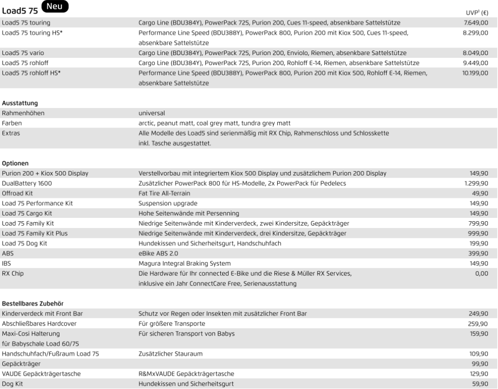 Das Riese und Müller Load5 75 Lastenrad eBike ist dank deutschem Hersteller nicht nur von höchster Qualität sondern ist auch individuell zusammenstellbar. So gibt es folgende Ausstattungsvarianten: